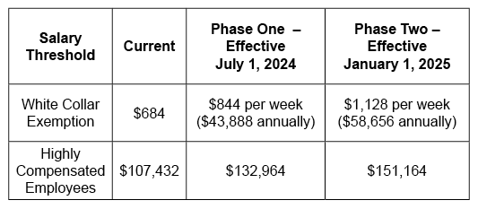 The 2024 final rule raises the salary threshold for the white collar and highly compensated exemptions in two phases.