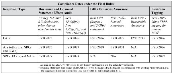 - Additional phase-in periods for disclosures pertaining to material expenditures, GHG emissions, the assurance requirement, and the electronic tagging requirement if the registrant is a LAF.