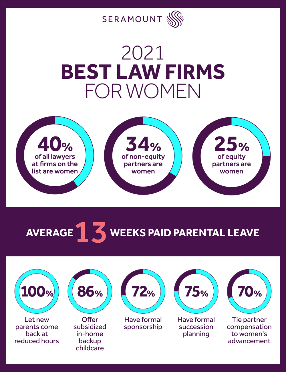 Seramount’s 2021 Best Law Firms for Women application includes more than 300 questions about attorney demographics at different levels, schedule flexibility, paid time off and parental leaves, and development and retention of women. This year, in light of COVID-19, several questions were added about the success of working from home for lawyers. The full “Best Law Firms for Women” list is available here.