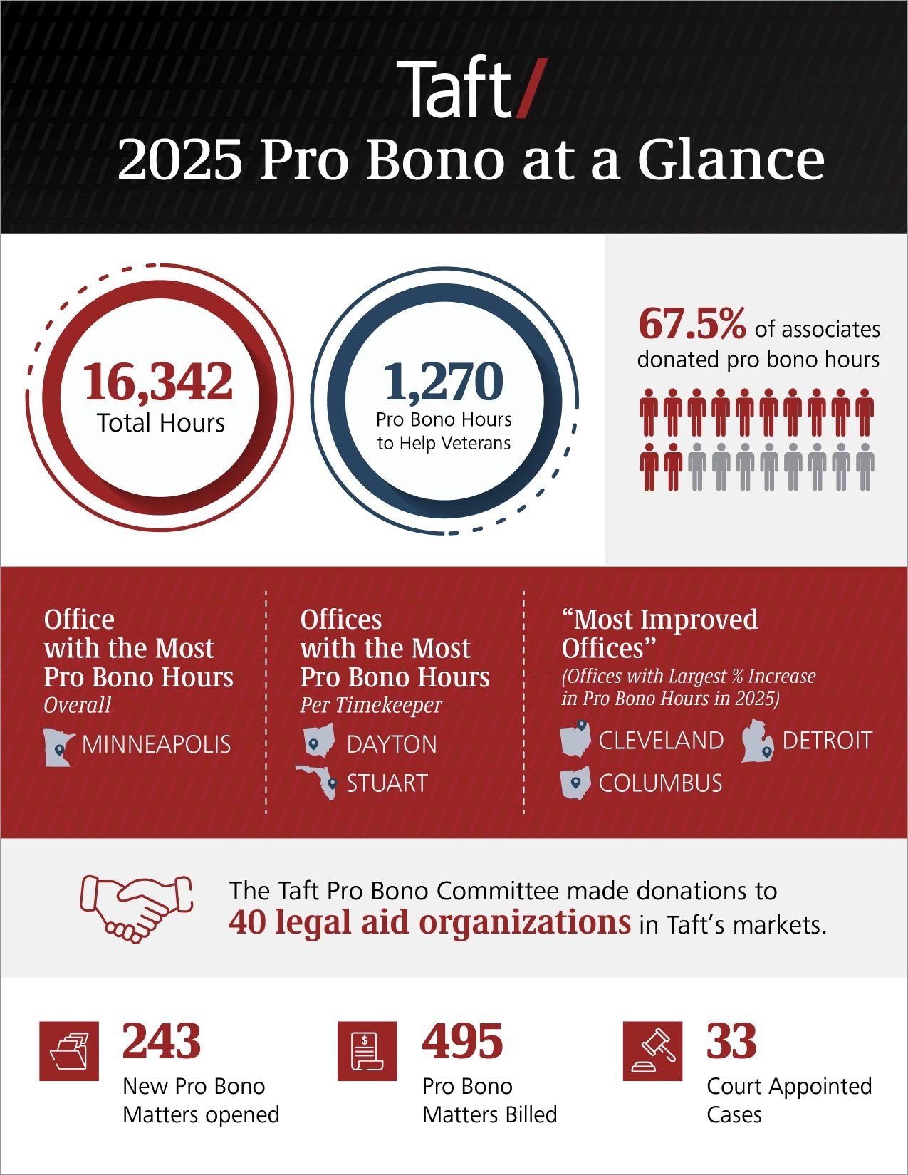 In 2025, Taft attorneys and staff demonstrated the firm’s continued commitment to pro bono service across its offices. Firmwide, Taft contributed 16,342 pro bono hours, including 243 new pro bono matters opened during the year. In addition to direct legal services, Taft made financial contributions to 40 legal aid organizations across the communities it serves.